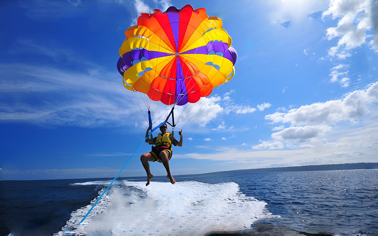 Parasailing is a water activity where a person is pulled by a boat while wearing a parachute, causing him to fly in the air above the water. It is a combination of aviation and water sports.